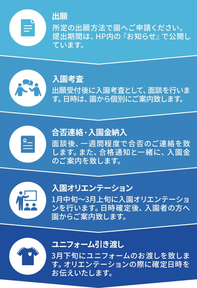 ご入園までの流れにつきましては、下記の手順に従って進めていきます。ご協力の程、宜しくお願い致します。